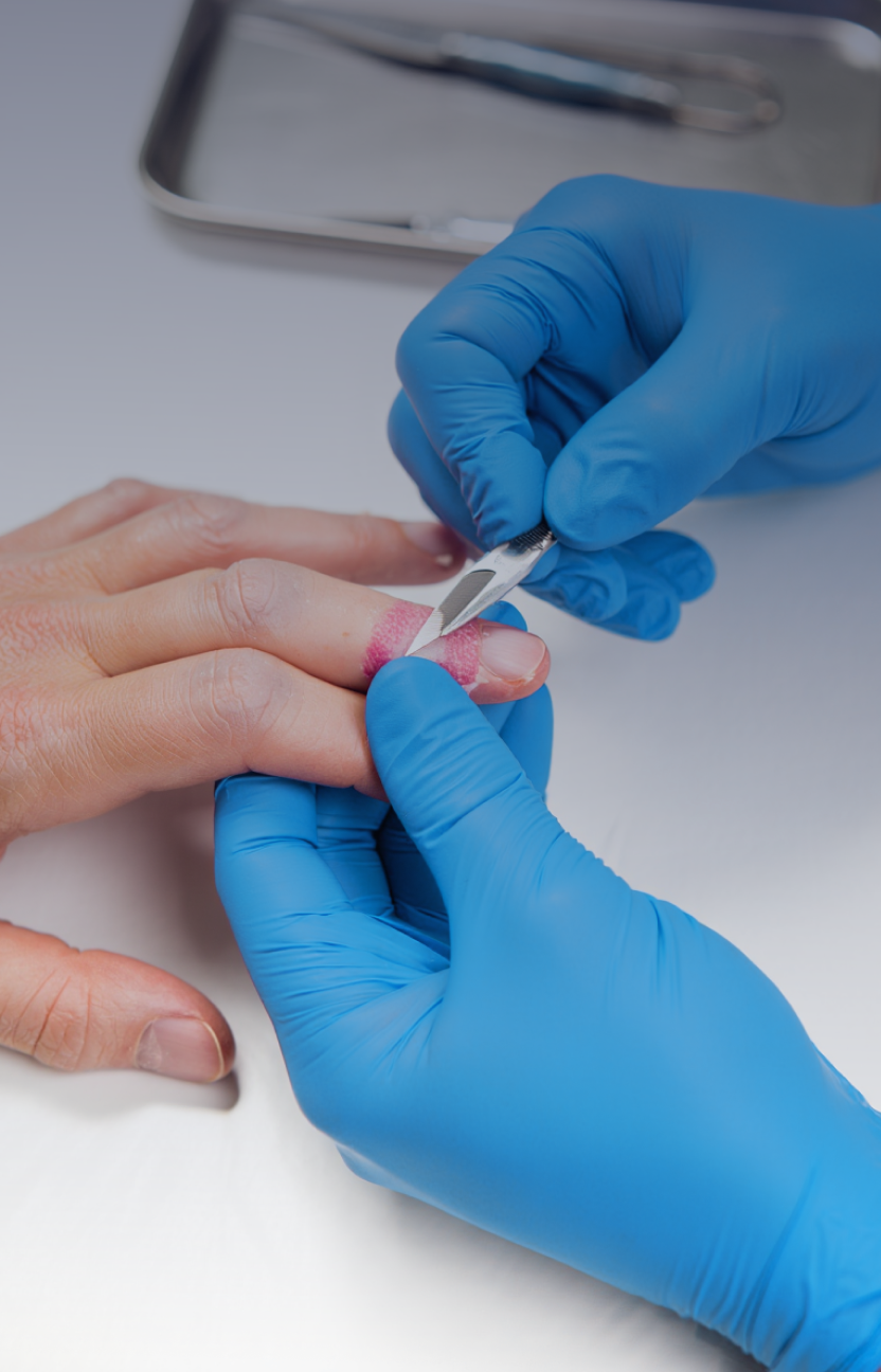 Prompt evaluation and drainage of painful nail fold infections (paronychia) caused by bacteria or ingrown nails. The procedure is performed under local anesthesia when needed, with sterile technique to relieve pressure and promote healing. Includes post-procedure care, dressing, and follow-up monitoring.