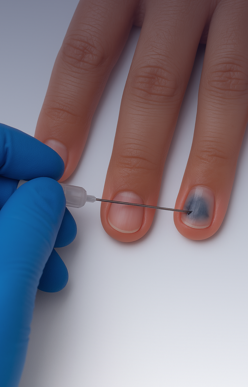Drainage of blood trapped beneath the nail (subungual hematoma) to relieve pain and prevent potential nail loss following trauma. Performed using sterile technique with cautery or fine bore needle, depending on clinical context. Includes evaluation, local anesthesia if needed, wound care, and post-procedure guidance.
